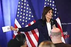 Nikki Haley, a former governor of South Carolina and U.S. ambassador to the United Nations, announced her campaign for the 2024 United States presidential election in a campaign video on February 14, 2023. On March 6, 2024, Haley suspended her campaign following Super Tuesday.[4] Haley is the first woman of color to be a major candidate for the Republican presidential nomination,[5] the first woman to run against a former president as a major party candidate,[6] and the first female former governor to run for president.[7]