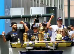 On April 21, in Game 3 of the first round of the playoffs, Jokić logged 37 points, 18 rebounds, five assists, and three steals in a 118–113 loss to the Warriors.[191] Three days later in Game 4, he recorded 37 points, eight rebounds, and six assists in a 126–121 victory.[192] Denver would go on to lose to Golden State in five games despite Jokić's 30-point, 19-rebound, eight-assist, and two-block outing in the 102–98 close-out loss. He scored 12 of his 30 points in the final four minutes of the game. After the game, former Defensive Player of the Year and perennial All-Defensive Team member Draymond Green found Jokić for a word: "I told him thank you for making me better. It's an honor and a pleasure to play someone so skilled. Usually when you have guys that talented and skilled, they're soft. And he's far, far from soft. He's an absolutely incredible player." For the playoffs, Jokić averaged 31.0 points, 13.2 rebounds, 5.8 assists, 1.6 steals, and 1.0 block per game on 57.5% shooting from the field.[193][194]