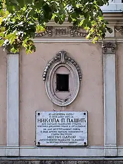 Commemorating 10th anniversary of his death, a white marble plaque was placed on the façade on 10 December 1936. It was placed by the local branch of the Yugoslav Radical Union with the inscription: On 10 December 1926 in this home died Nikola P. Pašić, leader of the People's Radical Party and great statesman of Serbia and Yugoslavia. On the day of the 10th commemorative anniversary, as a sign of deep national gratitude, this plaque is being placed by the Local Board of the Yugoslav Radical Union for Belgrade, Zemun and Pančevo.[1]
