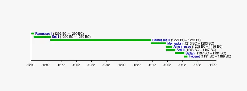 The pharaohs of the 19th Dynasty ruled for approximately 110 years: from c. 1292 to 1187 BC. Many of the pharaohs were buried in the Valley of the Kings in Thebes (designated KV). More information can be found on the Theban Mapping Project website.[4]