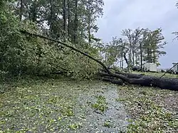 In the early morning of September 28, 2024, Hurricane Helene swept through the town of Ninety Six, taking trees and power lines with it, alongside damaging over 350 houses.[58][59] Many citizens of the town, especially those in more remote areas were trapped in their communities due to the vast amount of trees that had fallen on roads.[60] Many residents took it upon themselves to clear roads, using their own equipment and power tools to cut trees, allowing some to be able to leave their residences via automobile.[61] However, as citizens drove around, many rushed to nearby gas stations to fuel their vehicles, causing havoc,[62] with numerous fights breaking out.[63][64] The National Guard was deployed[65] to assist with the recovery efforts, and many troops were stationed at local gas stations.[66] For the next week, Ninety Six residents were left without power, with many soely relying on backup generators, adding to the need for fuel.[67] Citizens were eager to share what happened, with many needing to file insurance claims,[68][69] but cellular signal was extremely weak, with downtown Ninety Six having little-to-no service.[70] In Greenwood County, 23 cell towers were completely out of operation, with an additional 26 on back-up power and with limited range.[70] A week after the disaster, as power began to be restored, residents were able to heat and cool their homes, but many were still left without internet service, leaving them unable to work.[71] Nearly a month later, in early November, most residents had their internet service restored. The aftermath of Helene in the town is still visible as of 2025,[72] with many trees lying on the side of roads, and homes with tarps on their roofs.[73][74]