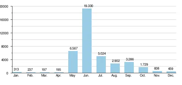 The value of average water discharge of Nizhnyaya Tunguska gives it eleventh place amongst largest rivers of Russia. The annual water discharge at the river's mouth is equal to 3,680 cubic metres per second (130,000 cu ft/s). The minimum value observed in 1967 was 2,861 cubic metres per second (101,000 cu ft/s); the maximum was 4,690 cubic metres per second (166,000 cu ft/s) in 1974 or, respectively, for the estuary of the river it was about 3,093 cubic metres per second (109,200 cu ft/s) and about 5,070 cubic metres per second (179,000 cu ft/s). The water supply of the river is from melting snow and summer rains. During winter season Nizhnyaya Tunguska contains little water as its basin lies in the region of permafrost and it has no subterranean water sources. According hydrological observations during 52 years, the minimum average monthly discharge was 27.8 cubic metres per second (980 cu ft/s) in March 1969—it was exceptionally dry winter—and the maximum value corresponds to June 1959 and was 31,500 cubic metres per second (1,110,000 cu ft/s)[7] The diagram below contains mean values of monthly average discharges calculated on the base of a 52-year-long period of observations at hydrological station "Bolshoy Porog" (фактория Большой Порог, Bolshoy Porog factory).[7][8]
