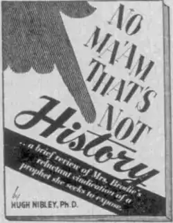 No, Ma'am, That's Not History is a short work written by Hugh Nibley to criticize Fawn M. Brodie's biography of Joseph Smith, No Man Knows My History. Nibley accuses Brodie of inconsistency and improper historical methodology. Scholars have criticized No, Ma'am for using the same kind of hyperbole that Nibley critiques in Brodie. Nibley's defenders explain that his acerbic satire does use similar rhetorical tools as Brodie does, which is part of its attention-grabbing intent. In 1999, The Salt Lake Tribune said the book "was wildly popular in Utah".[1]