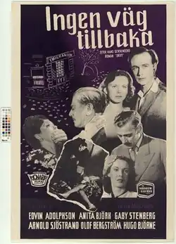 No Way Back (Swedish: Ingen väg tillbaka) is a 1947 Swedish drama film directed by and starring Edvin Adolphson and also featuring Anita Björk, Olof Bergström and Gaby Stenberg.[1] It was shot at the Centrumateljéerna Studios in Stockholm. The film's sets were designed by the art director Arthur Spjuth.