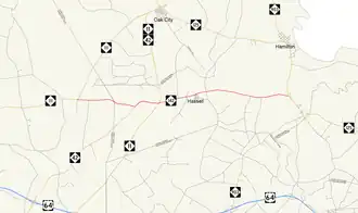 The western terminus of the highway is NC 111. Traveling east 2.5-mile (4.0 km), the highway beings a brief 1.1-mile (1.8 km) concurrency with NC 42 and joins the Tar Heel Trace scenic byway.[2] NC 42 departs the route at the NC 11 intersection, NC 142 continues 1.4-mile (2.3 km) to the rural community of Hassell. Leaving Hassell to the east, NC 142 terminates after 3.7-mile (6.0 km) with the NC 125/NC 903 junction. The Tar Heel Trace continues southbound on NC 125.