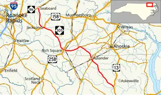 NC 305 begins at an intersection with US 13 north of Windsor, then heads northwesterly toward Burden and Connarlsta. The highway then crosses NC 11/NC 42 near Aulander and continues through downtown Aulander where it crosses the former route's business route. NC 305 then runs into southwestern Hertford County before it meets NC 561 near Northampton County. NC 305 and NC 561 run concurrently until Rich Square where it crosses US 258. Beyond US 258, NC 305 heads northwesterly toward Jackson and runs concurrently with US 158 westward into Jackson before it turns north towards Seaboard. After seven miles (11 km), NC 305 reaches its northern terminus at NC 186 in Seaboard.[4]