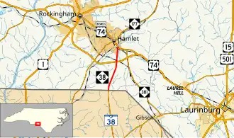 North Carolina Highway 38 (NC 38) is a primary state highway in the U.S. state of North Carolina. It runs from South Carolina state line to the town of Hamlet.