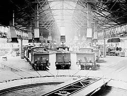 Steam locomotives E 462, R 483, and M 224 around one of the turntables circa 1905.