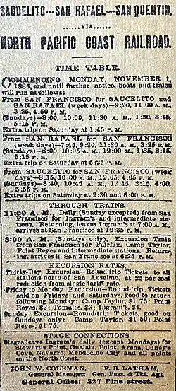 Schedule and rates for March 1887 (note the spelling for Sausalito)