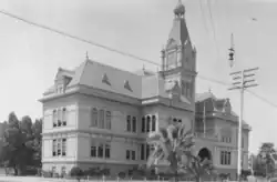 The first school building in Redwood City was called Redwood City Grammar School (also known as the Redwood City Public School) which was opened in September 1895 and located on Broadway Street across from the courthouse.[10][11] In the early years of the school, the first two floors of the building were dedicated to the elementary school and the third floor was occupied by Sequoia High School.[11] This was the only school on the Peninsula between San Francisco and Santa Clara at the time of its opening.[10] By 1927, the Redwood City Grammar School was demolished and replaced by the Fox Theatre.[11]