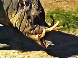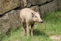 The North Sulawesi babirusa (Babyrousa celebensis) is a pig-like animal native to Sulawesi and some nearby islands (Lembeh, Buton and Muna) in Indonesia.[3] It has two pairs of large tusks composed of enlarged canine teeth. The upper canines penetrate the top of the snout, curving back toward the forehead. The North Sulawesi babirusa is threatened from hunting and deforestation.[1]