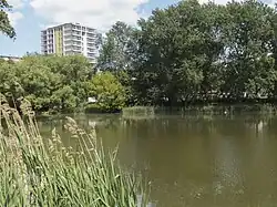 At the premises of the Służewiec Horse Racing Track, near Puławska Street, are located two small ponds known as Wyścigi Ponds, with areas of 0.4 i 0.21 ha.[37][38] To the west, at the northwestern boundary of North Ursynów and Wyczółki, is also located the Wyścigi Pond, with an area of 1.917 ha. Along the boundary, and through the pond also flows the Służew Stream.[1][38][39]