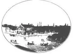 The main block of the 1882 building was nearly square in its proportions. It was two stories tall and four bays wide and deep. It was capped with a hipped roof with bracketed eaves, and the roof deck was edged with iron cresting. There was a small gabled dormer centered above the main facade. The main entrance into the facility was located to the right of center and was surrounded by a flat frame that was capped with a shallow, triangular pediment. The gymnasium extended off the back of the main block. Like the main block, it was a frame structure, and it measured 74 feet (23 m) by 48 feet (15 m).[4] Unlike the main block, it was capped with a gable roof.