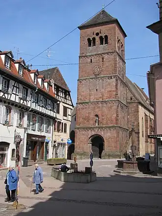 The bell tower is the part of the church that displays the most Romanesque style, with its archery banners and its checkered frieze that is typical of Romanesque buildings in the region, such as Marmoutier, Reutenbourg or Schweheim. The original tower had only four levels that were surmounted by a simple roof with two inclined slopes. The roof was raised at the end of the 14th century. This is why the upper two levels of the current tower are made of different stones and includes claw holes in comparison to the bottom levels of the church. During this time, a large frame spire was also built at the top of the church. This spire was knocked down in 1760 and was then replaced with a pyramid roof. This roof was then slightly modified in 1834, which gave it its current shape. During this time, the last seats of the tower were also modified, which also explains their different aspect.[1] The last level of the bell tower opens to the outside with twin bays with Romanesque style columns on each side. The staircase leaning to the South side of the church was built in the 19th century. Accessible by this staircase is the central part of the church. From the nave, there is access to the upper floors of the bell tower as well as the set of attics.[2]