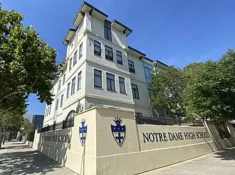 Notre Dame is an all-girls Catholic high school situated in downtown San Jose. The school was founded as the College of Notre Dame by the Catholic Sisters of Notre Dame de Namur. The Sisters of Notre Dame also ran St Joseph's (now the site of Adobe's HQs), St Leo's, St. Clare's, St Francis Xavier and St Mary's where many of the female students later came to Notre Dame High School and Notre Dame de Namur College.[3]