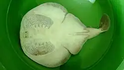 The numbray or spottail sleeper ray (Narke dipterygia) is a species of electric ray in the family Narkidae. It may be found in shallow muddy estuaries or offshore depths. It is a weak swimmer that lies on the bottom, commonly buried. It eats small marine invertebrates and fish. It pounces on its prey and wraps its body around its prey, killing or stunning it with electrical shocks.[2] It has been observed that Numbrays are not as common as other types of rays in the area around the Indian Ocean. This can be attributed to the relatively large doubling time for a population, reaching up to 18 years.