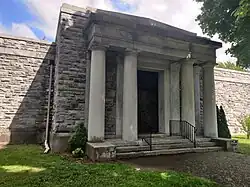 In 1913, Oakwood built a magnificent marble mausoleum, designed by the Buffalo architectural firm Green and Wicks. The Oakwood Mausoleum was built to the very highest standards with foot-thick walls of concrete covered by hand cut gray Vermont marble. The exterior features soaring stone columns supporting a centered entrance portico. Within were crypts for over 350 interred individuals, and the interior was faced and floored in white Vermont marble, lit by clerestory windows and two stained glass windows (one by Louis Comfort Tiffany). Huge bronze doors enter into a chapel space centered in the mausoleum.