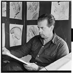 Einarson produced both paintings and satirical drawings, and he was connected with the Brochmann movement, endorsed by the magazine Alternativt Samfunn. Together with his fellow illustrator Ernst Berentsen, he published the socially critical cartoon book Du slette tid in 1935, and after the Second World War he published, among other things, the magazines Trollspeilet and § 100.[1][2] However, Odd Einarson was primarily known as a wandering bohemian with a beret and a lush beard in his "rolling atelier," a car dubbed Ruslebo.[6][7] He spent just three or four minutes to create caricature drawings of interested passersby, and from 1947 to 1985 he is said to have portrayed over half a million Scandinavians under the signature Einarson.[1] Odd Einarson's works have been purchased by the National Gallery.[1]