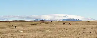 The 7800 years BP Kjalhraun flow to the north-east has a similar area but covers only 11 km3 (2.6 cu mi) with its eastern portion broken up by faulting from the Hofsjökull volcanic system.[13][14] On the Kjalhraun flow's northern edge is the Hveravellir high-temperature geothermal field with an area of 2.5 km2 (0.97 sq mi).[6]