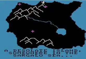 The map of islands in the Sargalo Sea in which you navigate your ship consists of a ring of islands around the perimeter of the screen.[1]: 9  Your ship starts out next to the island you just left (in the lower right of the screen) while "Lapour", the island now held by the Caliph (your goal) is in the upper left. You may land on other islands to stock up on food and resources but for the most part these islands are not fully explorable as the first one was, and serve only as places to stock up on supplies by displaying a few lines of text after you land (with one exception—see below). Navigation is a complex scheme, as you are at the mercy of wind and currents (and whether the vessel has any intact sails left) and you cannot navigate directly as you can in early Ultima titles. You must set the sails in different directions in order to catch the wind, and raise and lower anchor to start and stop your ship. Hazards include running aground if the player weighs anchor too close to shore, being caught in a whirlpool which may destroy the ship or destroy its sails, scurvy among the crew, calm winds (which is harmless to the ship but prevents any progress until the winds start up again) and falling off the edge of the world if the ship gets too close to the edge of the map.