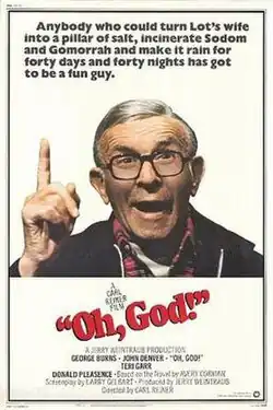 Oh, God! is a 1977 American comedy film starring George Burns and John Denver. Based on the 1971 novel by Avery Corman, the film was directed by Carl Reiner from a screenplay by Larry Gelbart. The story centers on supermarket manager Jerry Landers (Denver), who is chosen by God (Burns) to spread His message despite skepticism of the media, religious authorities, and his own wife (Teri Garr).