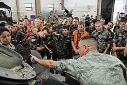 Air Force Reserve Technical Sgt. Mike Lamantia explains the C-130 Modular Aerial Spray System (MASS) to a group of Ohio Civil Air Patrol cadets.