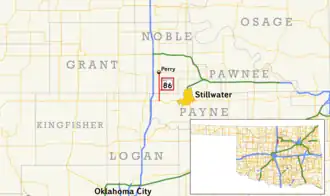 State Highway 86 (abbreviated SH-86) is a state highway in the U.S. state of Oklahoma that connects SH-51 with Perry and is 12.06 miles (19.41 km) long. The highway is contained wholly in Payne and Noble Counties. SH-86 has no lettered spurs or loops.