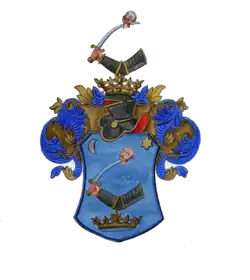 According to I. Nagy, the family probably received the coat of arms mentioned below from Louis I in 1364.[4] The shield with a blue background is complemented by a golden crown, above which is an armored arm with a silver saber with a severed head of a Turk. In the corners of the shield there is a golden star on the right side and a silver crescent on the left side. The differences are in the depiction of the Turk's head. Sometimes the head with a turban is impaled, sometimes it is bare and impaled in the center of the saber. These two variations also alternate in the jewel (in heraldry, an object placed above the helmet above the coat of arms). There are further inconsistencies in the depiction of the jewel. Sometimes the jewel is only the arm from the shield, sometimes also the crescent with a star, which are placed just above the elbow bend. The covers are gold-blue and silver-red.[1]