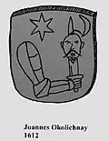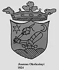 Unlike the coat of arms of Bernard (1512) and Ján (1541)[30] The "quartered" coat of arms of the Bratislava and Varadín bishop Ján Okolicsányi († 1736) from 1726 is the most visually striking version of the coat of arms using a crescent and a star - in combination with an arm with a sabre and a severed head. In the first and fourth fields it depicts a crescent and a star, and in the second and third fields an arm with a sabre and a severed head. Pavol Okolicsányi also used a similar coat of arms, but with the order of the fields reversed (with an arm with a sabre and a severed head in the first and fourth fields and a crescent and a star in the second and third fields).[31]