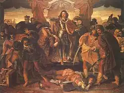 The authors trace the origin of the family to the reign of King Bela IV (1235–1270) to Serafín I., A. Húščava in his study, which he devoted exclusively to this problem, confirmed that the founder of the Okolicsányi family was Serafín I, the first mention of whom dates back to 1282. Serafín served as a servient of the Zvolen governor Mikuláš in the royal army. In the autumn of 1280, he actively participated in the battle of Lake Hód (today Hódmezóvásárhely – north of Szeged), where the royal army, led by King Ladislaus IV, defeated the Cumans.[12] Serafin allegedly acted extremely heroically in the battle, when "not without shedding his own blood he valiantly cut off the head of a noble Cuman and showed it to the king". For this and many other services, Ladislaus IV confirmed his ownership of Črmno and the Svätý kríž in 1282.[7]: 9–10 [1]