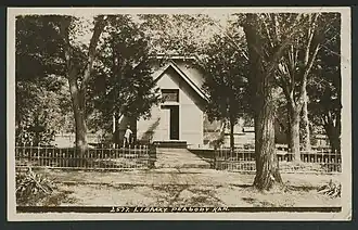 The city of Peabody was named in 1871 after F.H. Peabody, of Boston, formerly vice-president of the Atchison, Topeka and Santa Fe Railway company.[book 1][book 2] In May 1874, Mr. Peabody visited the new city, at which time he announced he would donate money for a library building, furniture, books, periodicals and landscaping if the Peabody township would secure four lots for the site. The contract for construction was awarded in early 1875, and the library was opened to the public in June; in February 1876 the state legislature authorized the township to levy a tax to support the library. The structure housed the library facilities until 1914.[book 3][2]