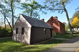 This schoolhouse was built in 1755 in the York Corner area to provide schooling for that area's children. The building's window openings were originally covered in oiled paper, which would have provided a limited amount of daylight. (The interior is currently lit by electric lights added by the museum.) It was rescued from demolition by the museum, its previous use having been as a chicken coop.[2]