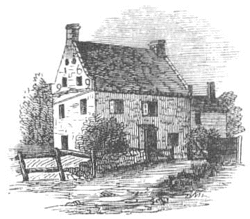 The front of the original Vechte–Cortelyou House (c. 1699); where the Maryland troops commanded by Lord Stirling and Mordecai Gist made two attacks against over two thousand British troops in a rear-guard action that allowed a majority of Stirling's 1,600-strong command to escape. The house was reconstructed in 1934 after a fire.[5]