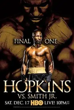 In January 2015, Hopkins expressed interest in moving down to the super middleweight division to either challenge WBA and IBF super middleweight champion Carl Froch for his titles, or face super middleweight contenders James DeGale or George Groves.[5] Froch, who was mulling retirement at the time, decided to vacate his IBF title and declined the chance to face Hopkins, calling such a fight a "lose-lose situation" and stating "If I win people will say 'he beat a 50-year-old man'. If I lose people would say 'what's going on? You've ruined your legacy."[6] With Froch now out of the picture, Hopkins turned his attention to DeGale, who would win the IBF super middleweight title Froch had vacated in May 2015.[7] Negotiations between the two fighters, Hopkins claimed, were in the advanced stages with the fight set to take place in DeGale's native England,[8] however, talks eventually stalled and DeGale instead agreed to make his first title defense against former Lucian Bute.[9] Hopkins would then begin negotiations with then-WBO super middleweight champion Arthur Abraham, with Hopkins going as far to tell USA Today that a fight with Abraham would "absolutely" happen, but Abraham chose to instead face Martin Murray.[10][11] Hopkins next eyed undefeated unified middleweight champion Gennady Golovkin with the proposed fight happening at the 168 super middleweight limit. Golovkin expressed some interest in the fight, giving it a "50/50" chance of happening and both Golovkin's manager Tom Loeffler and Golden Boy Promotions president Eric Gomez admitted to being engaged in talks about the fight.[12] This fight too fell through when Golovkin instead took a fight with his mandatory challenger Dominic Wade, with Hopkins telling the media that the window to face Golovkin "had closed."[13] With no further announcements regarding a possible opponent, Hopkins reiterated in October his wish for a final fight, though Gomez stated that while they were still looking at opportunities, "absolutely nothing" was set in regards to a possible opponent or date.[14] Just days later, however, Hopkins finally found an opponent after two years of searching, reaching an agreement to face Joe Smith Jr. on December 17, 2016.[15] Hopkins confirmed that the fight would be his last and reverted to his famous longtime nickname "The Executioner" after having used "The Alien" for his three previous fights.[16]