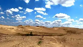 The landscape is quite varied, with sandy-steppe, semi-arid steppe, meadows, reed beds, and forest stands. The dunes of the Radensk sector are interspersed with patches of shrubs, lakes and birch groves (12% of the area).[1]