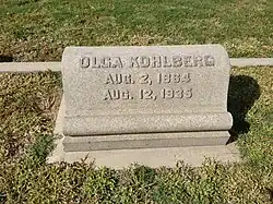 In 1910, Ernst Kohlberg was shot by an angry tenant.[4] Olga Kohlberg died in El Paso after a short illness on August 12, 1935.[14] She was buried in the Mt. Sinai Cemetery in Concordia Cemetery.[15]