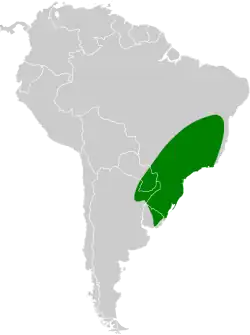 The olivaceous elaenia is found from southern Goiás and southern Bahia in eastern Brazil south through eastern Paraguay and into eastern Uruguay and northern Argentina's Formosa, Chaco, and Misiones provinces.[8][9][10] Its first record in Uruguay did not come until 2000.[11] The olivaceous elaenia inhabits interior, edges, and clearings of humid tropical forest and also gallery forest, secondary forest, and more open woodlands. In elevation it ranges from sea level to 2,000 m (6,600 ft).[8][9][10]