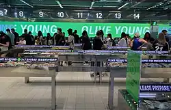 The checkout area of an Olive Young store in Myeongdong, Seoul