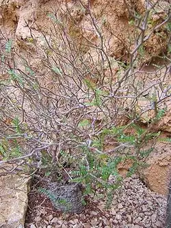 It has small (less than 2 mm) red flowers in winter. The inflorescence is at the end of short branches and often consist of about five flowers. Woody cuttings need a soil mixture kept uniformly moist for propagation. It can also be propagated using pieces of the tuberous roots.