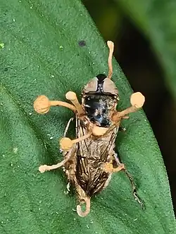 Other entomopathogenic fungi manipulate their hosts by making the fly look for the part of the plant where the stem is, and then the fly hangs itself by its legs. This hanging behavior seems to help the fungus grow and develop. O. dipterigena manipulates its host to land on a leaf without needing to hang itself. In this particular species, once the fly dies, a part of the fungus grows out from inside the insect through its head, resembling its antennae.[3] The stroma of O. dipterigena is yellow.