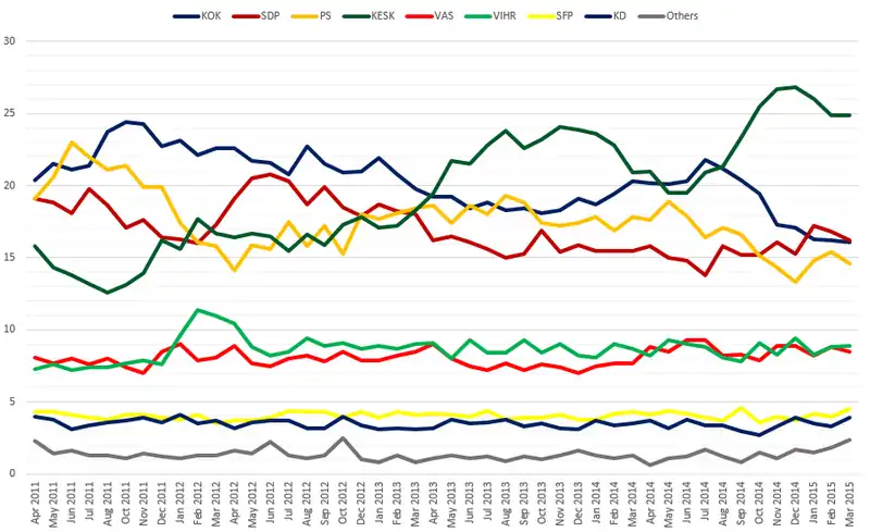 | 3 Nov 2014–19 Mar 2015 | Taloustutkimus[note 3] | 33 | 35 | 31 | 56 | 17 | 15 | 8 | 4 | 1 |
