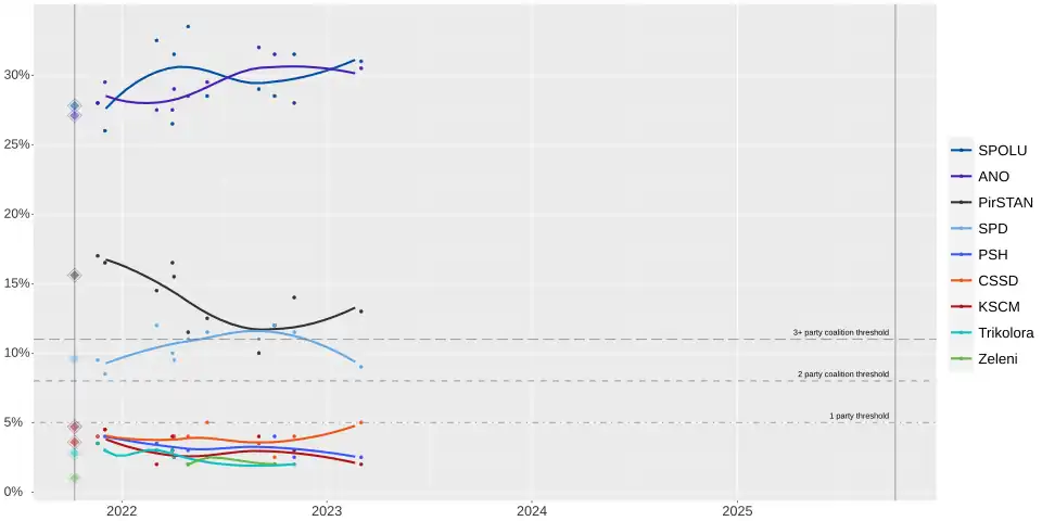 | Kantar CZ | 17 Apr – 5 May 2023 | 63 | 75 | 13 | 22 | 18 | 0 | 9 | 0 | 0 | 0 | 0 | 12 | ||