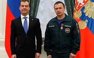 Russian President Dmitry Medvedev awarding the Order of Courage to EMERCOM mine rescue detachment commander Valery Zelyakov on May 3, 2012