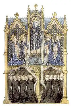 King Philip the Fair and his three sons (the future kings Louis X, Philip V and Charles IV) alongside the monks of Val des Écoliers invoke Saint Louis in an illustration from the cartulary of Royallieux