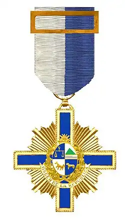 The Order of the Oriental Republic of Uruguay was a decoration created by the 1973-1985 civic-military dictatorship to award to foreign personalities for extraordinary meritorious acts rendered to the country or for reciprocity purposes. It was eliminated after the repeal of the rule that created it by Law No. 15738.[1] In 1992 the Medal of the Oriental Republic of Uruguay was created.[2]