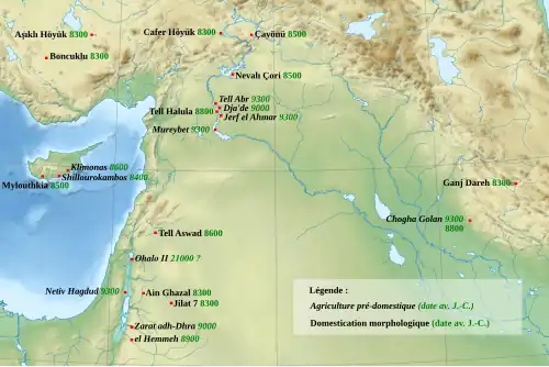In any case, the idea of rapid evolution and a smooth, linear process must be set aside: domestication is undoubtedly the result of numerous attempts, and the scattered evidence of pre-domestication undoubtedly includes involuntary changes and aborted experiments.[91] Since the early 2000s, the prevailing view among domestication specialists has therefore been that a decisive process began in the PPNA, around 9500 BC, and took roughly a millennium to materialize, or even more. In any case, it is for sites from this period that it has been proposed for the first time to identify the presence of “pre-domestic” agriculture, i.e. with morphologically wild cereals and legumes,[92][51] using the cluster of clues method. These candidate sites for early domestication are located in the Levant, in the Middle Euphrates region (Jerf el Ahmar, Tell 'Abr 3, Mureybet), in the southern Levant (Zahrat adh-Dhra' 2, Gilgal, Netiv HaGdud), also in southeastern Anatolia (Çayönü) and one case in the western Zagros (Chogha Golan).[93][94][95] These findings tend to invalidate the hypothesis of a single center for all domestications throughout the Near East.[96] Migrations and trade between communities probably brought together the mutations made in different places.[97]