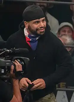 On August 31, 2019, at All Out, Ortiz and Santana debuted as heels for All Elite Wrestling (AEW), attacking both Lucha Brothers (Pentagón Jr. and Fénix) and Nick Jackson after their tag team ladder match.[6] On October 2, the inaugural episode of Dynamite, they teamed with Chris Jericho in the main event and defeated The Elite (Kenny Omega and The Young Bucks).[7] Led by Jericho, they subsequently formed a new faction along with Sammy Guevara and Jake Hager called The Inner Circle.[8] On the November 18, 2020 episode of Dynamite, Konnan reunited with Ortiz and Santana during an Inner Circle party in Las Vegas.[9] On the February 9, 2022 episode of AEW Dynamite, the Inner Circle had a team meeting that ended with Sammy Guevara throwing his vest and walking out. It was later announced that Jericho and Hager would face Santana and Ortiz in a tag team match the following week, with it being billed as the Inner Circle Implodes match.[10] On the March 9, 2022 episode of Dynamite, the Inner Circle was disbanded after Jericho and Hager attacked Santana and Ortiz and formed an alliance with 2point0 and Daniel Garcia. On the June 15, 2022 special episode of Dynamite Road Rager, Ortiz would have his head shaved after losing a hair vs. hair match to Jericho. On the June 29, 2022 at Blood And Guts, they competed in the main event, defeating the Jericho Appreciation Society.