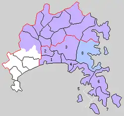 1. Ishinomaki; 2. Hebita; 3.Inai 4. Watanoha; 5. Oginohama; 6. Ohara; 7. Ayukawa; 8. Onagawa; Blue = no change in status; Purple = Ishinomaki City