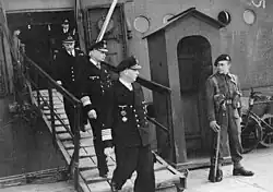 Kummetz (3rd right) leaving a British ship after the British takeover of Kiel, 1945