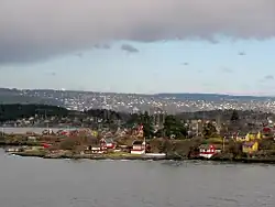 The Oslofjord (Norwegian: Oslofjorden, Urban East Norwegian: [ˈʊ̂ʂlʊˌfjuːɳ]; English: Oslo Fjord[1][2][3]) is an inlet in southeastern Norway. The 120-kilometre (75 mi) fjord begins at the small village of Bonn in Frogn Municipality and stretching northwards to the city of Oslo, and then curving to the east and then south again. It then flows south to an imaginary line running between the Torbjørnskjær Lighthouse and Færder Lighthouse where it becomes part of the Skagerrak strait. The Skagerrak connects the North Sea and the Kattegat sea area, which leads to the Baltic Sea. The Oslofjord is not a fjord in the geological sense, but in the Norwegian language, the term fjord can refer to a wide range of waterways including inlets such as this one.[4]